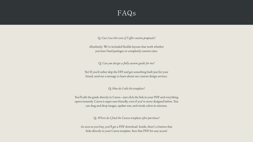 Whether you offer custom proposals or curated packages, this guide helps you showcase your pricing and process in a way that feels thoughtful, refined, and on-brand.